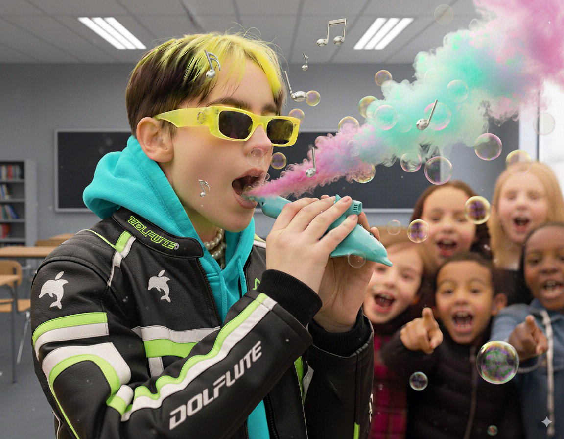 Dolflute SE is your practical solution to an absurd world — the world's first all-in-one dolfin, flute, bubble launcher, virtual-vape. Whether you're adding a touch of humor to your day or looking for a fun, lighthearted alternative to unhealthy habits, the Dolflute SE delivers pure, portable fun in a compact, delightfully impractical package. Available in three fashion-forward colors while supplies last. Designed and built by Famous New Media Artist Jeremy Bailey in Calgary Canada. (smoke effect requires Snapchat filter)